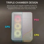 A unique triple-chamber design was created to isolate hot components for effective cooling and maximum performance at all times. Separate chambers for the CPU, GPU/motherboard, and PSU, cables, and storage allow for exceptional thermals and an easy PC building process.