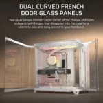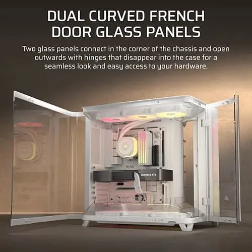 Two glass panels connect in the corner of the chassis and open outwards with hinges that disappear for a seamless look and easy access to your hardware.