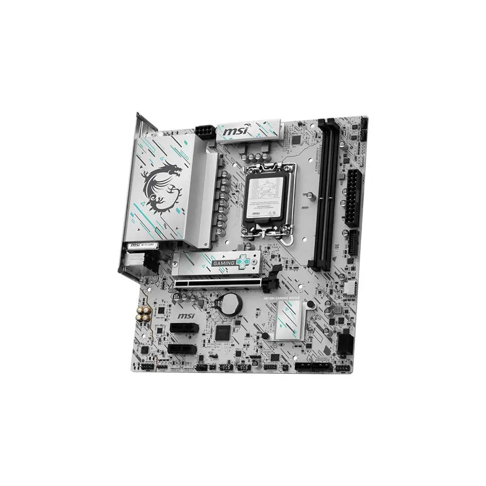 The H810M GAMING WIFI6E motherboard features a sleek, cyber-inspired pattern with teal and black geometric accents on a silver base. Featuring USB 20G Type-C port, Wi-Fi 6E, 2.5G LAN, PCIe 5.0 solution and M.2 Shield Frozr, ready for Intel Core Ultra processors.