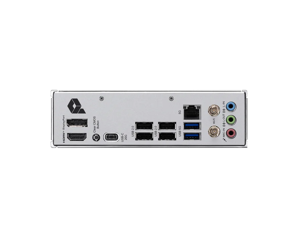 | BACK PANEL PORTS | DisplayPort Clear CMOS Button USB 20Gbps Type-C USB 2.0 5G LAN Wi-Fi / Bluetooth Audio Connectors HDMI™ USB 5Gbps Type-A |